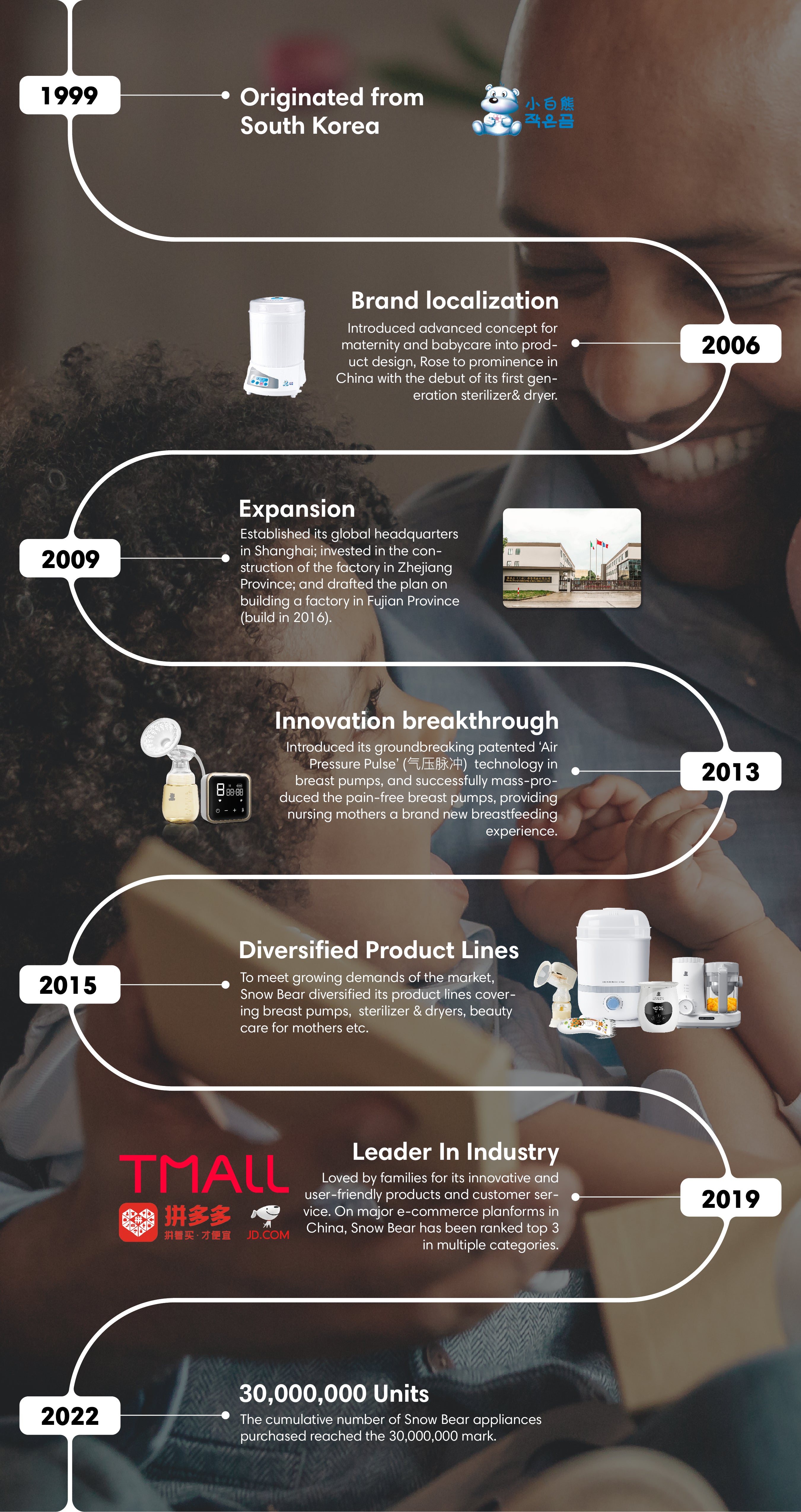 SnowBear rose to prominence in China with the debut of its first generation bottle sterilizer & dryer in 2006. Over the past decade, SnowBear has served and been loved by millions of families and households with its product ecosystem that includes breast pumps, sterilizer& dryers, smart kettles& bottle warmers, baby food cookers and personal care.