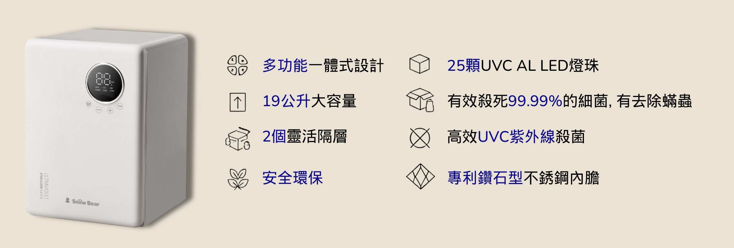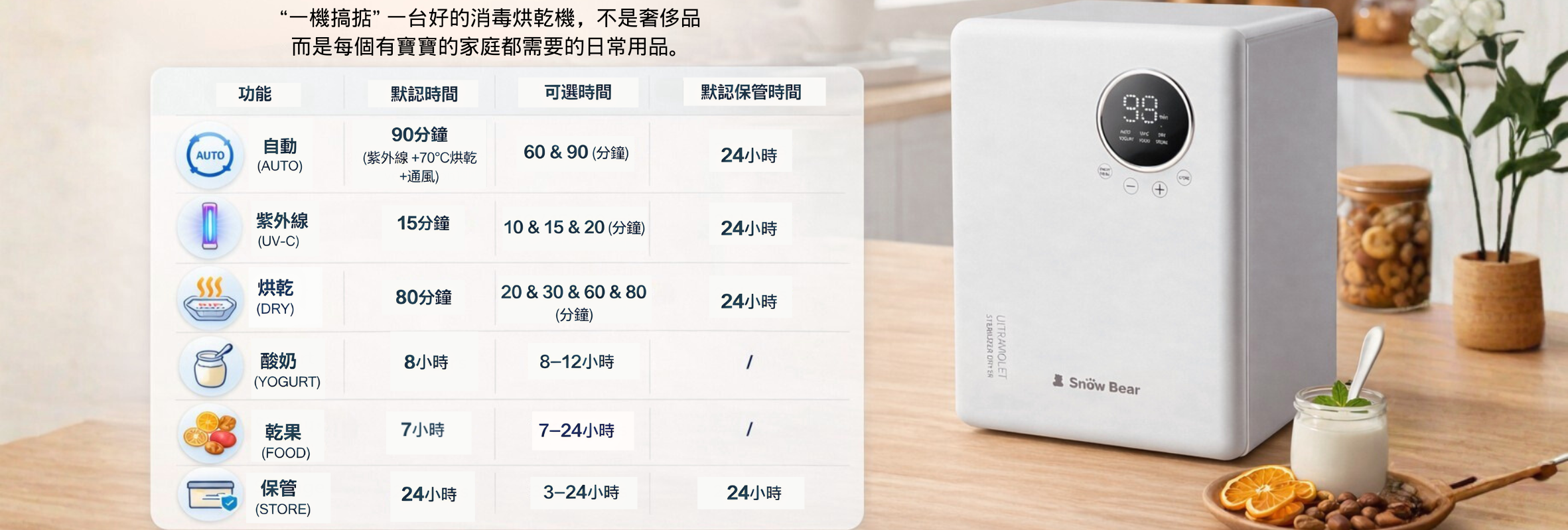 - 紫外線消毒、烘乾、保管、酸奶、乾果功能一步到位