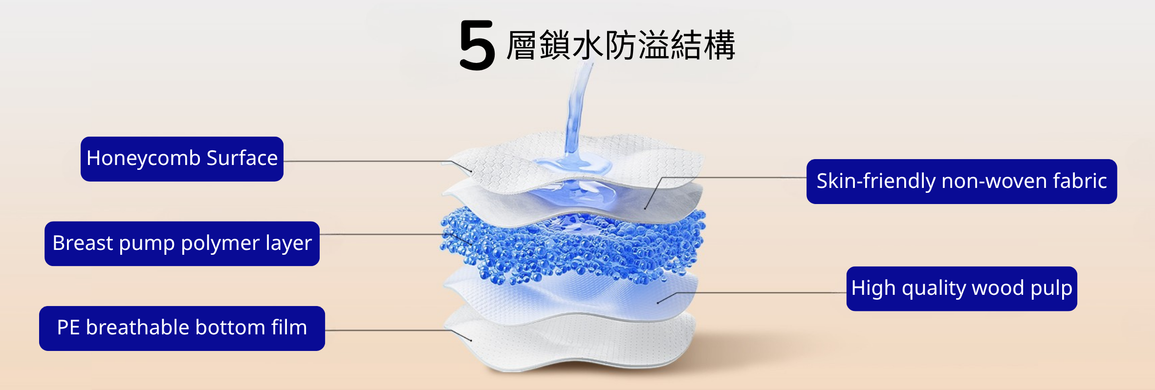 - 超強吸收:5層防漏芯層-鎖水防漏設計,吸收力強,防止回流
